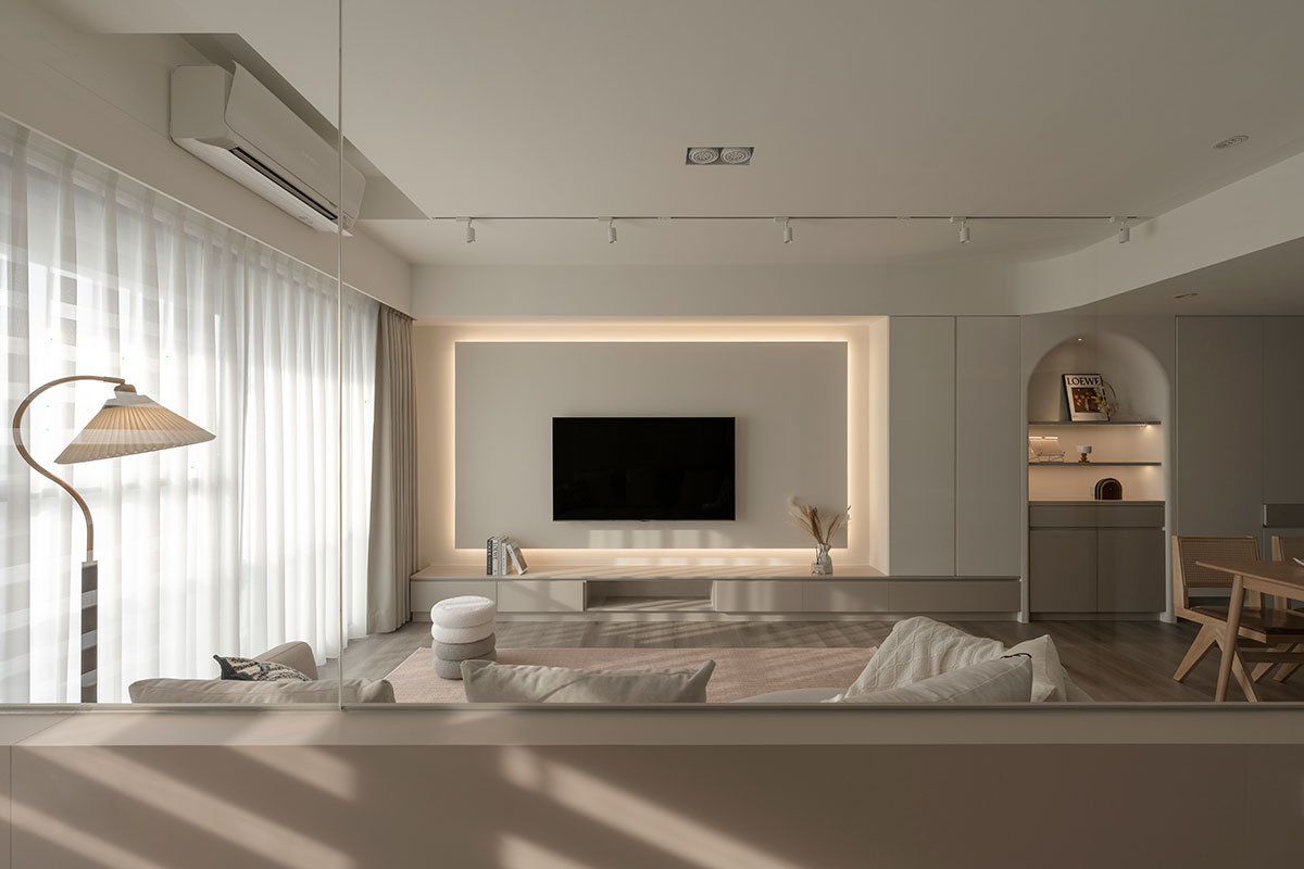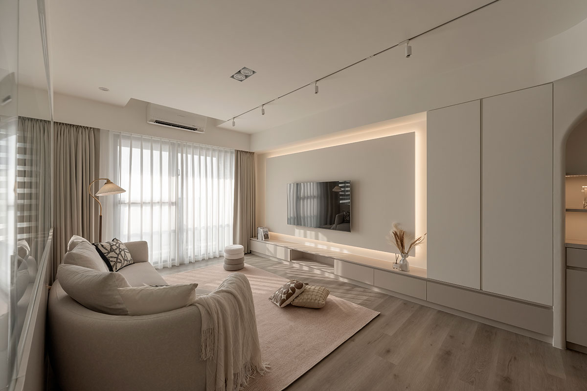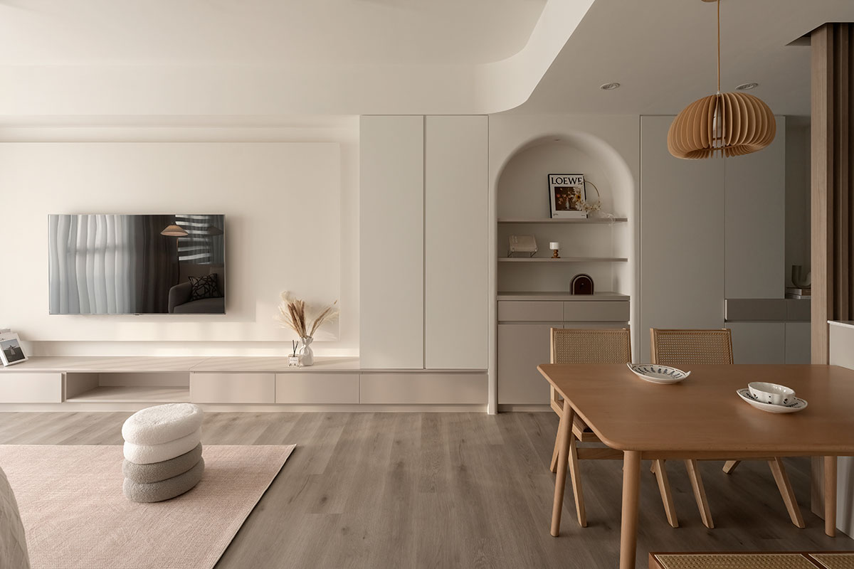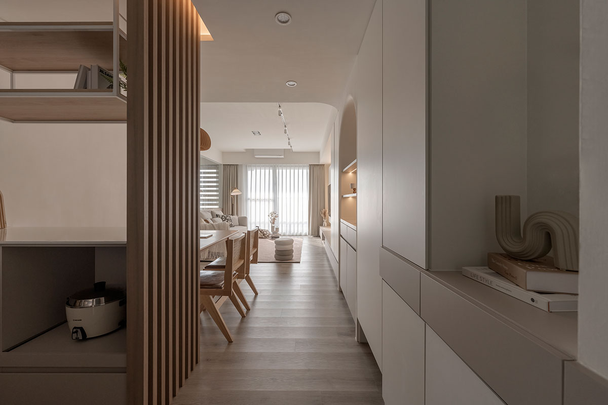 從進入家門的那一刻,即是褪去心中煩憂的起點。眼前漫染一室的低飽和柔調,將歸者輕擁入懷,相偕足下木質略為粗糙卻飽含暖意的樸實肌理,共呈溫潤和緩的安心感受,也傳達回家即可放鬆的溫柔理念;在溫暖無擾的環境中,無須思考多餘瑣事,一杯咖啡、一本書、一張沙發,便能靜心沉浸屬於自己的愜意時光。