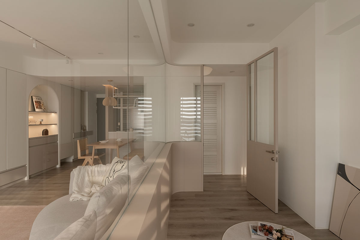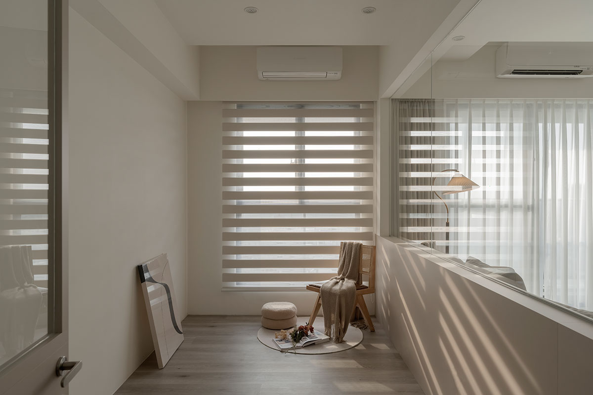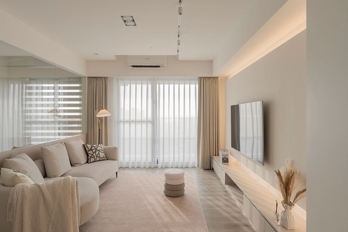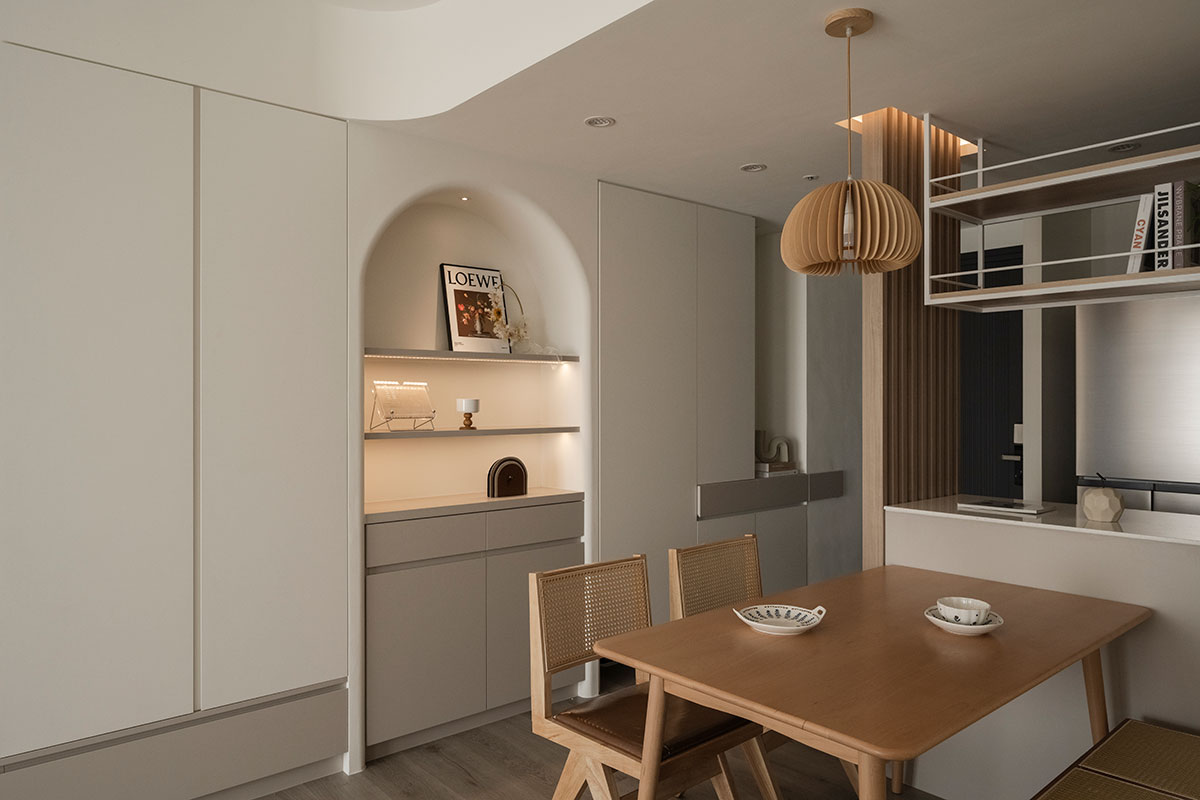 從進入家門的那一刻,即是褪去心中煩憂的起點。眼前漫染一室的低飽和柔調,將歸者輕擁入懷,相偕足下木質略為粗糙卻飽含暖意的樸實肌理,共呈溫潤和緩的安心感受,也傳達回家即可放鬆的溫柔理念;在溫暖無擾的環境中,無須思考多餘瑣事,一杯咖啡、一本書、一張沙發,便能靜心沉浸屬於自己的愜意時光。