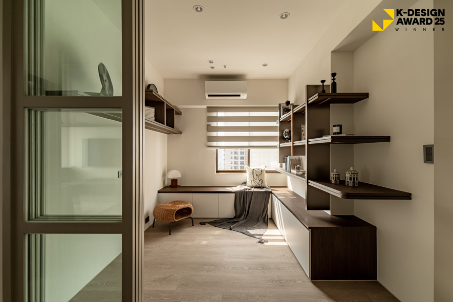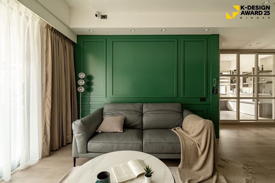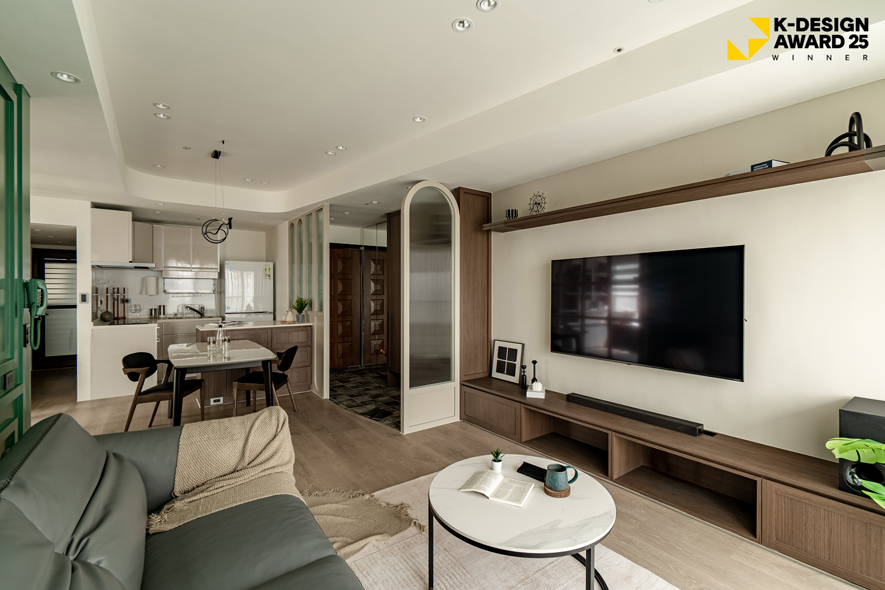 帝特設計 品牌總監 趙國豪、設計總監 楊翊 以奶茶調性的簡約畫面營造柔和氛圍,綴點深綠與胡桃木色,為作品《青苑遊》贏得2025韓國K-DESIGN AWARD「Winner」殊榮!設計中融合眾多異國元素,並以空間氛圍連結居者往昔的快樂旅居回憶,藉大地色系搭配圓弧、線條等造型,令居者清晨時振奮精神、歸宅後舒緩身心,並統整各項所需,沿動線鋪設便利機能,呈遞一處切合住者喜好需求的夢想家宅。